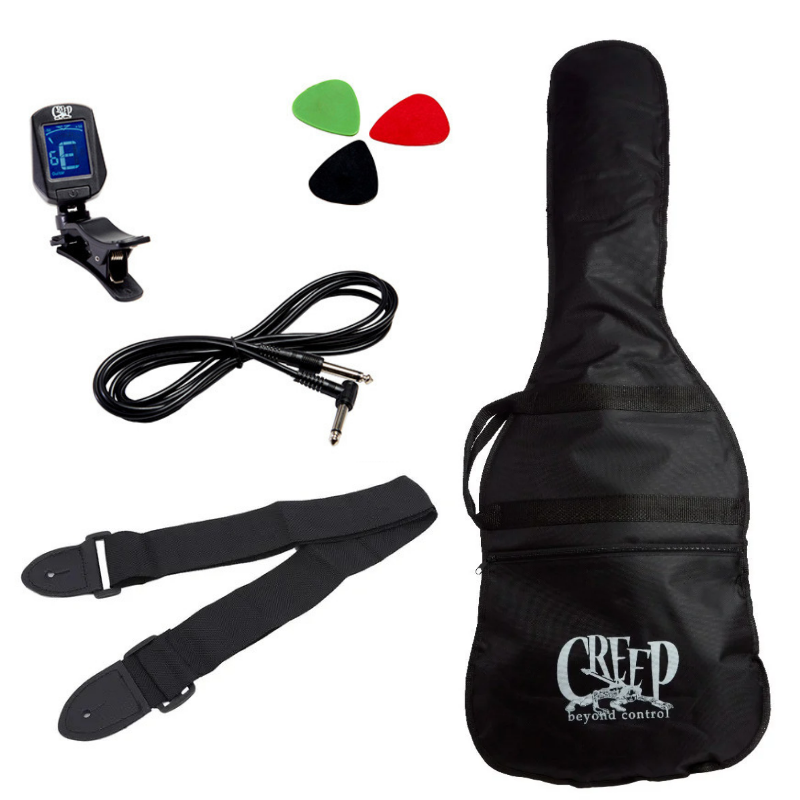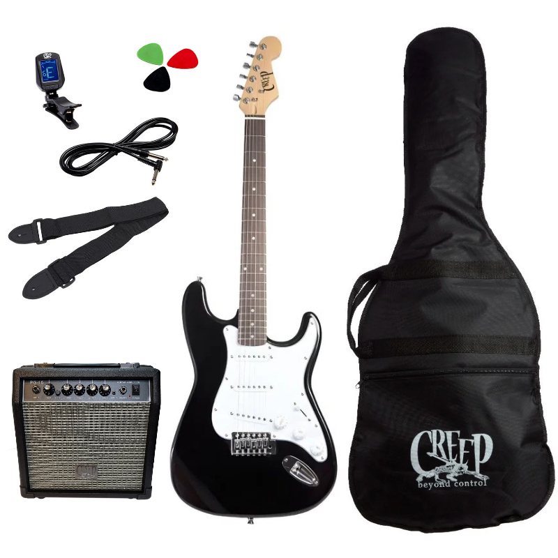 Descubre el sonido clásico del rock con este Pack Creep Stratocaster para principiantes, ideal para quienes dan sus primeros pasos en el mundo de la guitarra eléctrica. Diseñado para ofrecer comodidad, estilo y un tono versátil, este pack incluye todo lo necesario para empezar a tocar desde el primer día.