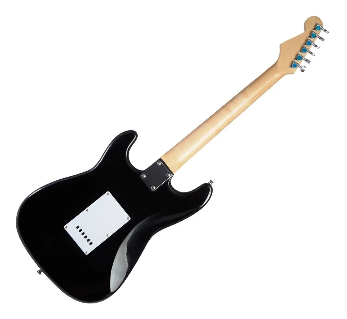 La guitarra cuenta con el icónico cuerpo tipo Stratocaster, cómodo y equilibrado, con tres pastillas single coil que brindan un sonido brillante y definido, perfecto para estilos como rock, blues, pop o funk. Su mástil de arce suave al tacto y su diapasón cómodo facilitan el aprendizaje y la práctica prolongada.